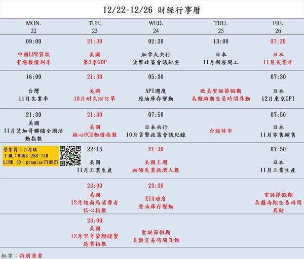 以上是2025年12月22日至12月26日的市場重要經濟數據公布時間清單,這些數據的公布可能會影響市場情緒和投資者的交易策略,建議投資者密切關注這些公布時間,了解數據結果與預期之間的差異,並做好相應的風險管理。